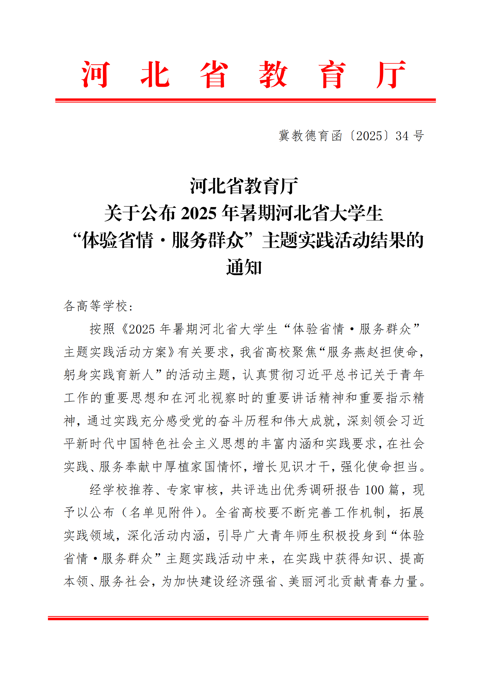 2025年暑期河北省大学生“体验省情·服务群众”主题实践活动由省教育厅主办,全省高校广大学子利用暑期积极参与并提交调研报告,经专家审核,最终评选出优秀报告100篇。