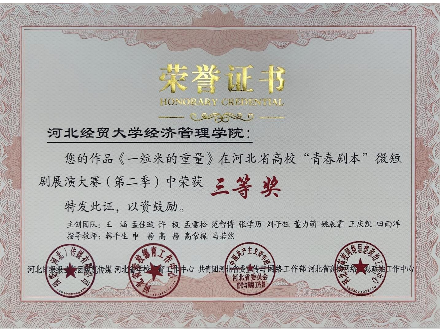 管理系师生创作拍摄的微短剧《一粒米的重量》以鲜明的立意主题,彰显新时代青年的责任与担当,在众多参赛作品中脱颖而出,荣获本次微短剧展演大赛三等奖。