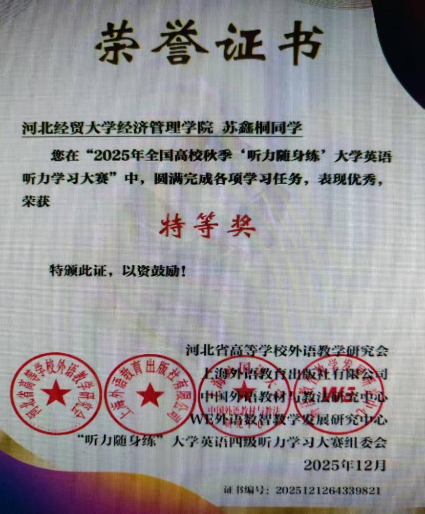 组织参与了2025年全国高校秋季 “听力随身练”大学英语听力学习大赛河北赛区比赛。最终1765名同学凭借坚持不懈的努力训练和扎实雄厚的听力功底脱颖而出,喜获各类奖项!
