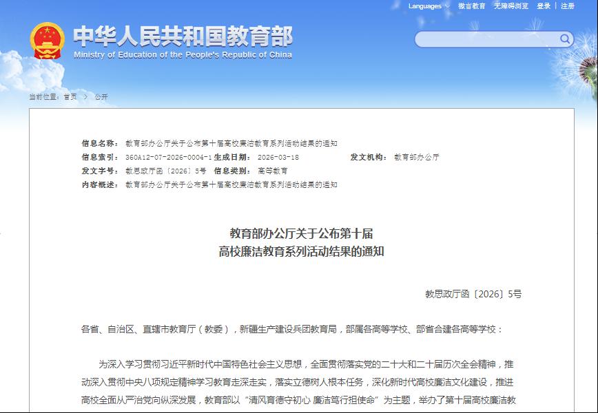4月3日,教育部公布第十届高校廉洁教育系列活动评选结果,不雅视频