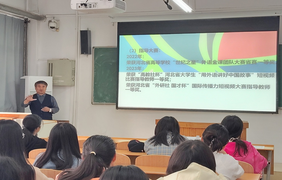 赵占亚首先结合自身教学经历与学院竞赛成果,围绕英语水平提升与学科竞赛参与介绍了成立2025级新生英语特训营的意义初衷和近期即将推出的系列活动。在竞赛宣讲环节,赵占亚就“高教社杯”河北省大学生“用外语讲好中国故事”短视频大赛等5项英语短视频大赛、“外研社Ÿ国才杯”“理解当代中国”全国大学生英语能力大赛等6项英语国家级赛事和不雅视频