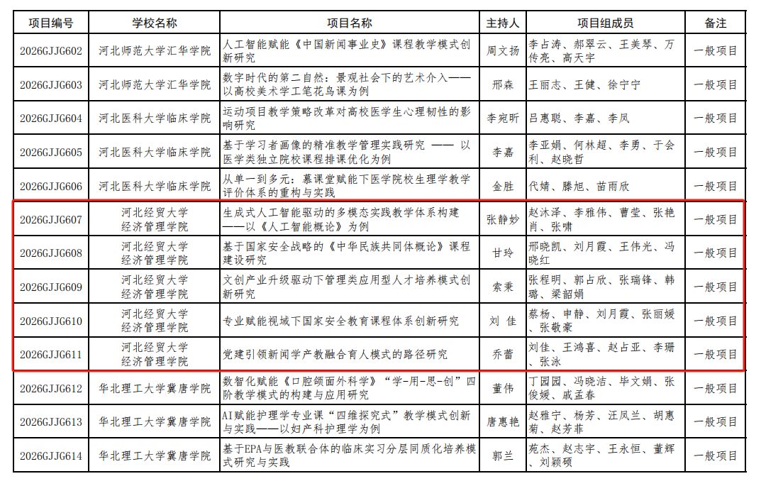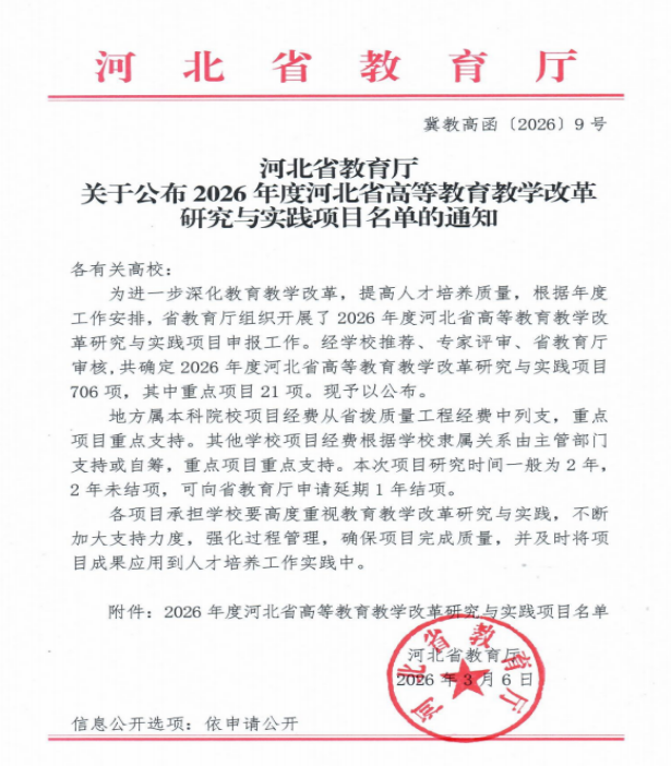 日前,省教育厅关于公布《2026年度河北省高等教育教学改革研究与实践项目名单的通知》,不雅视频 申报的五项课题均获批立项。